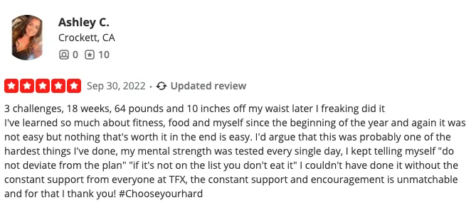 "64 pounds and 10 inches off my waist later, I learned so much about fitness, food, and myself. It wasn’t easy, but worth it. This tested my mental strength daily. The support and structure at TFX made all the difference."