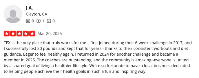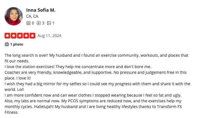 "My husband and I found an exercise community, workouts, and places that fit our needs. The coaches help me concentrate more and don’t bore me. No pressure, no judgment. My PCOS symptoms are reduced, and I’m more confident now—I can wear cute clothes I stopped wearing because they didn't fit. We’re living healthier thanks to Transform FX!"